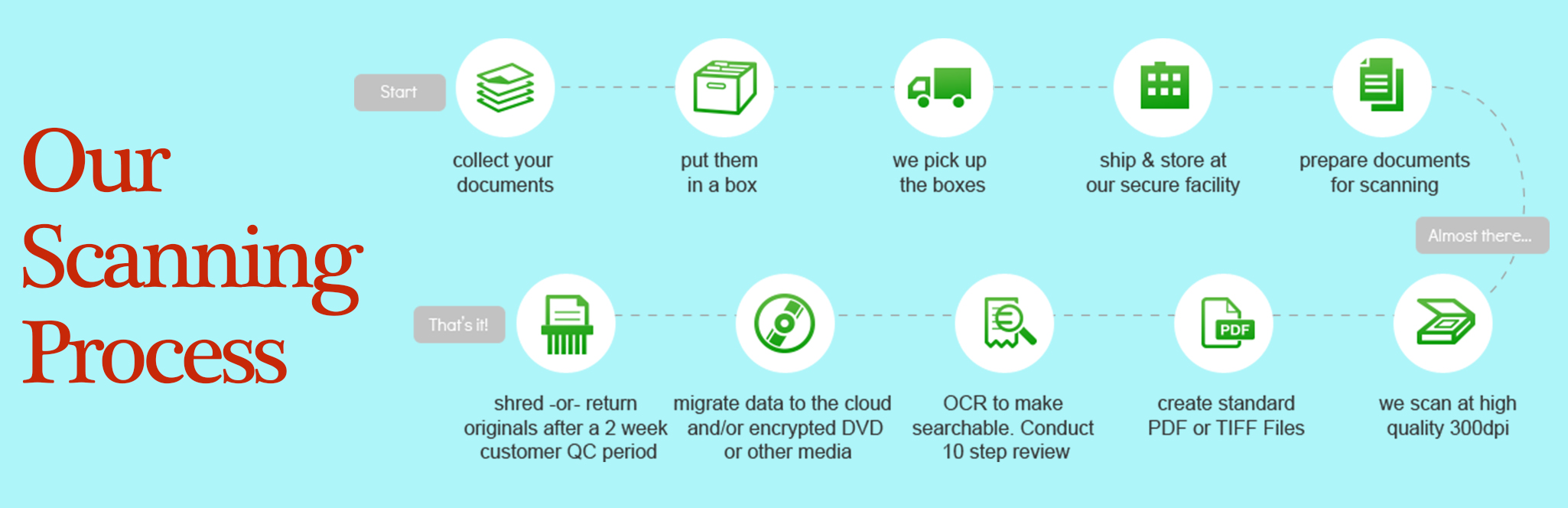 We guarantee that you will be happy with the work we do for you. Our deeply experienced scanning teams ensure that your documents are secured, prepped properly, quickly scanned, converted into electronic images in PDF, TIFF or any other format you need. We can also customize our document scanning process to meet any unique or custom requirements.